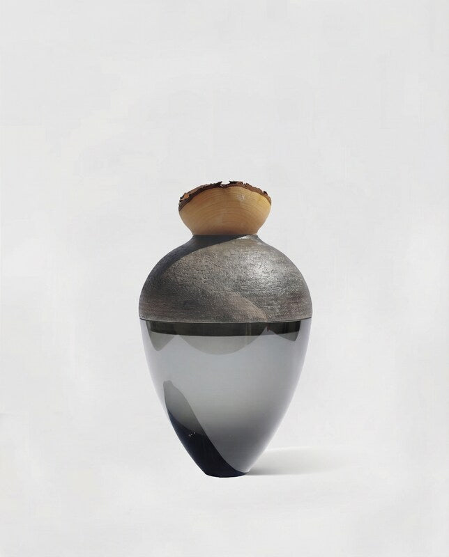 At its base, a mouth-blown glass vase from Czechia offers lightness and clarity. This is crowned with a Raku ceramic bowl, thrown and glazed by hand in Northern Germany, bringing an earthy, organic texture. The piece is completed with a hand-turned wooden bowl, crafted deep in the Finnish forests — warm, tactile, and timeless.