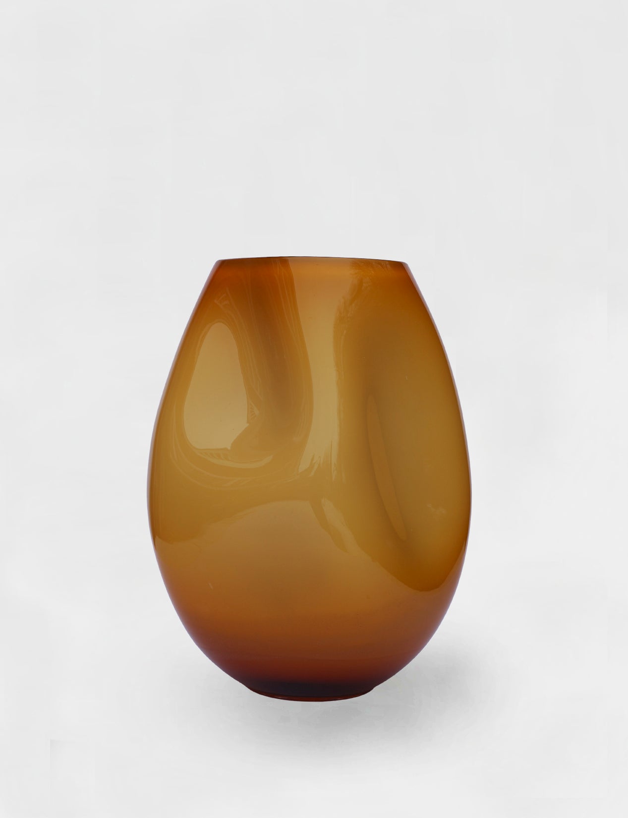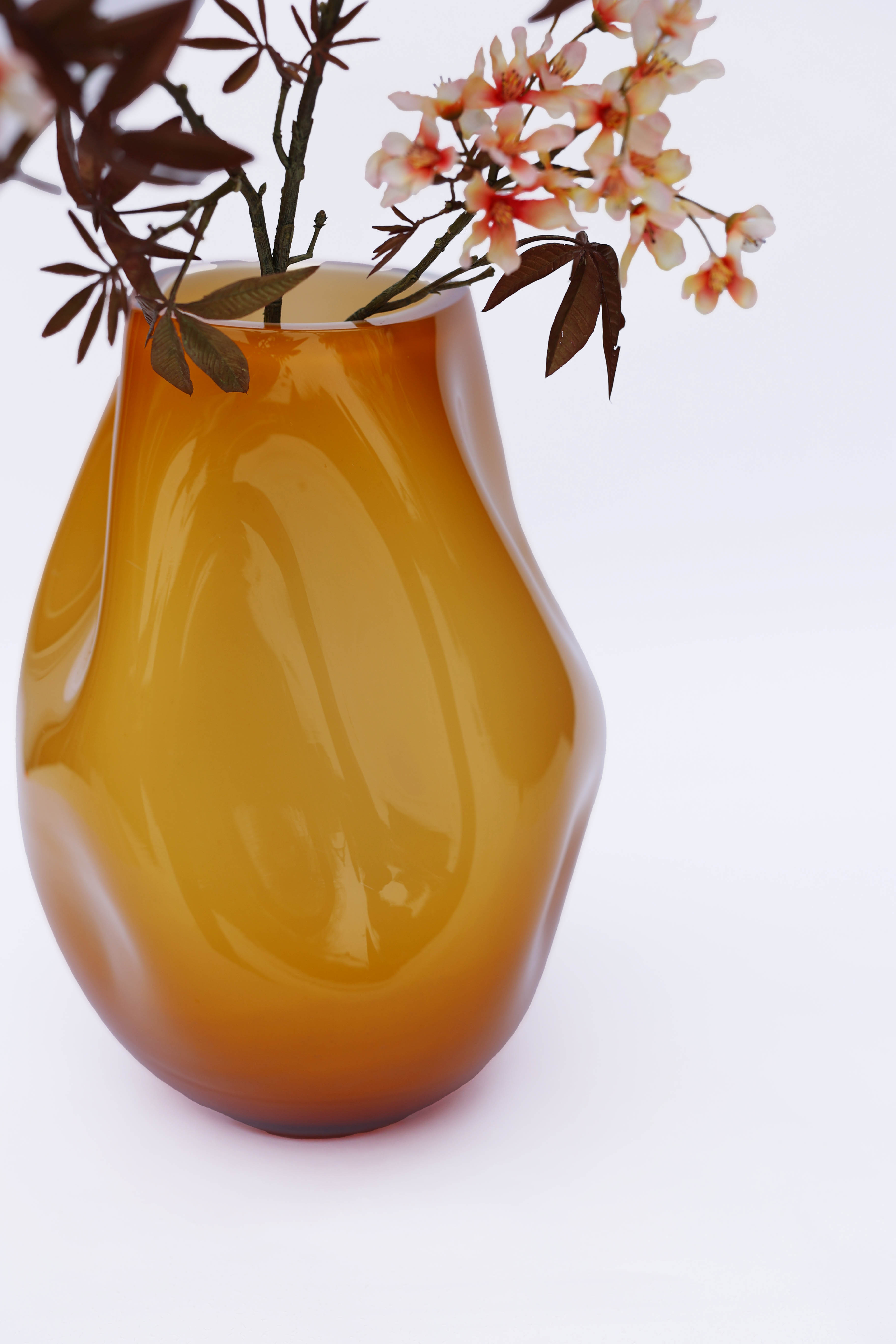 Layers of warm caramel tones blend seamlessly into a soft opaline interior, while an amber overlay adds depth and richness to the color. The interplay of translucency and texture creates a vibrant yet refined expression, ensuring that no two vases are ever exactly alike.