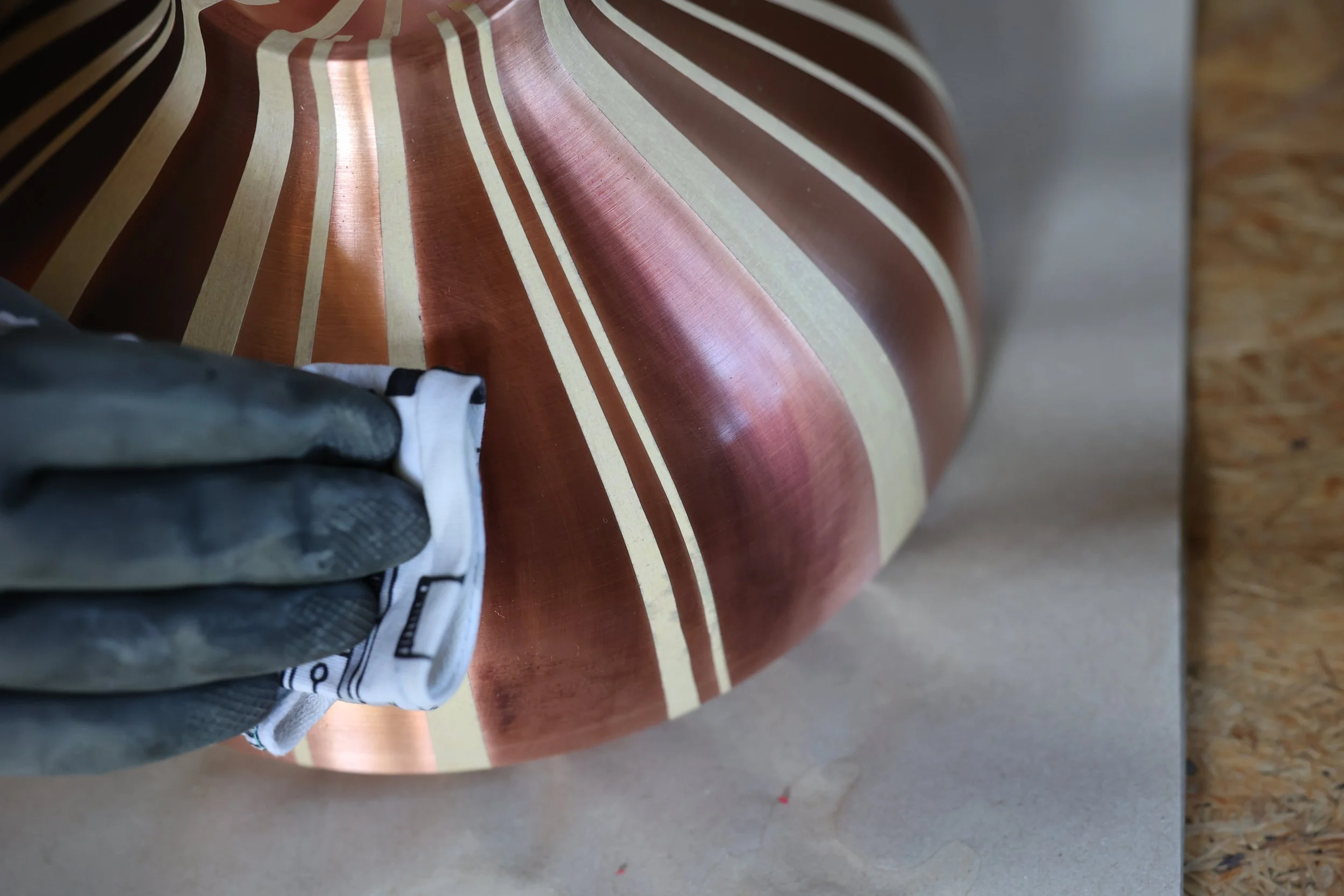 Each piece is unique in shape, with the marking created by hand in order to control the spread of the patina.
